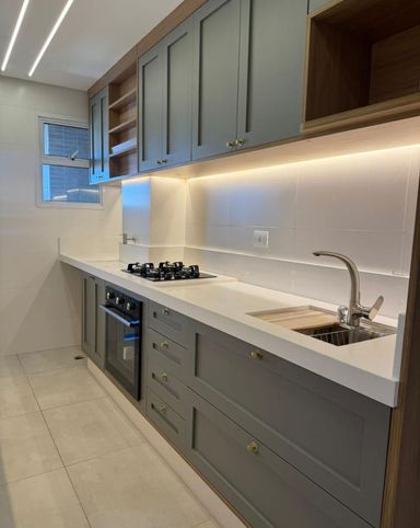 Cozinha americana planejada, funcional e elegante, conectada à área social