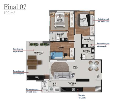 Apartamentos de 2 e 3 dormitórios com 1, 2 e 3 suítes e 2 ou 3 vagas de garagem.